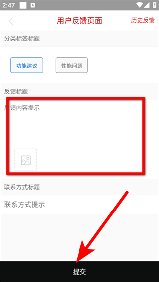 4、在用戶反饋頁面,填寫反饋內(nèi)容后點(diǎn)擊提交按鈕,即可完成留言操作。