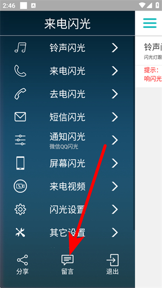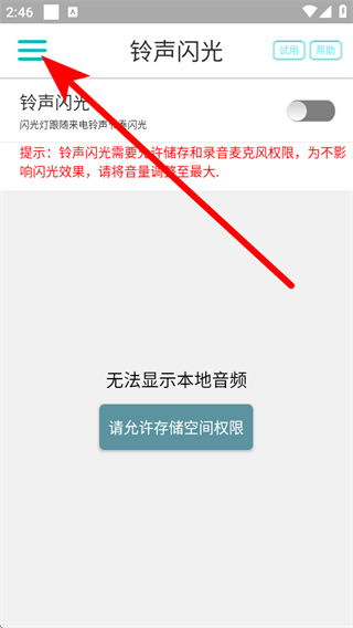 1、在來電閃光鈴聲閃光頁面,點(diǎn)擊左上角菜單按鈕,進(jìn)入功能菜單界面。