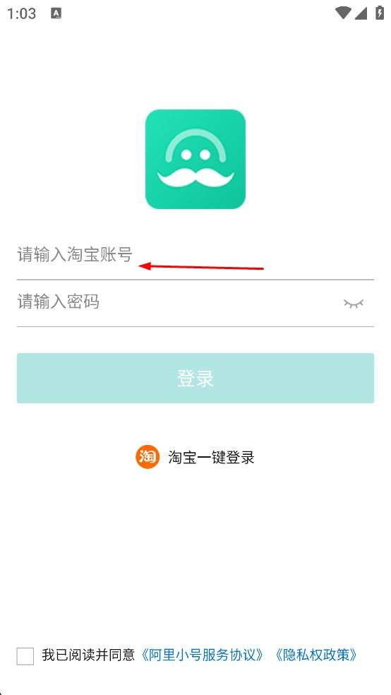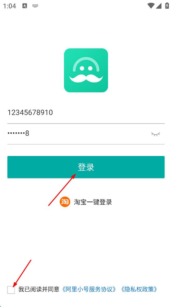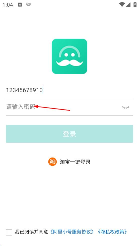 4、填寫好賬號(hào)和密碼后,勾選“我已閱讀并同意阿里小號(hào)服務(wù)協(xié)議,隱私權(quán)政策選項(xiàng),然后點(diǎn)擊“登錄”按鈕,即可嘗試登錄阿里小號(hào)app。
