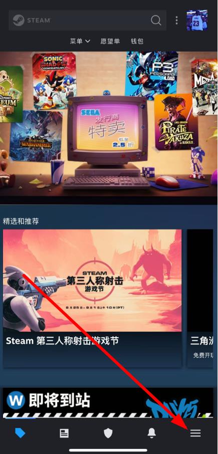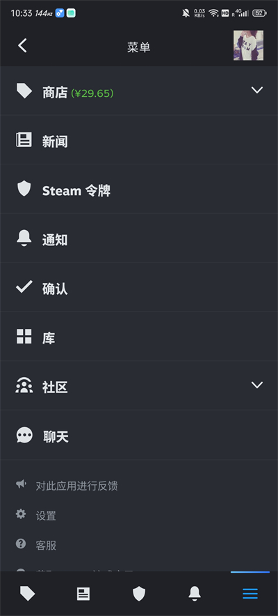1、打開Steam應(yīng)用,點擊底部導(dǎo)航欄中類似三橫線的菜單按鈕。