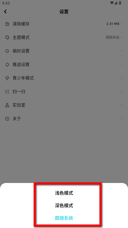 4、在彈出的主題模式選擇框中,選擇淺色模式、深色模式或跟隨系統(tǒng)即可完成設置。