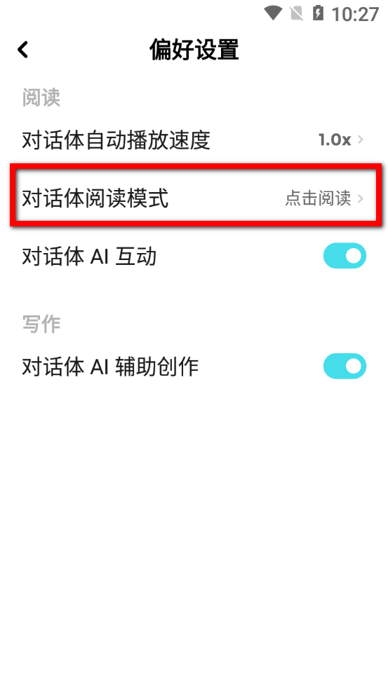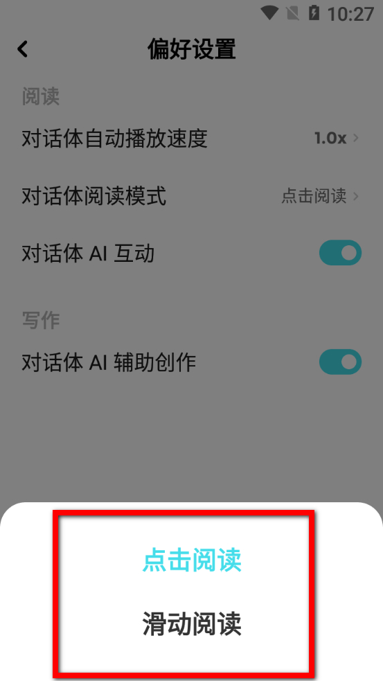 3、在偏好設置頁面,點擊對話體閱讀模式選項,彈出閱讀模式選擇框。
