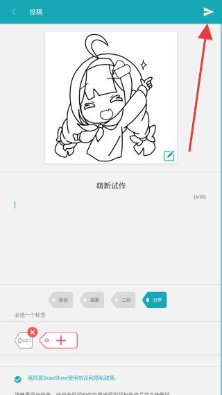 3、進(jìn)入作品投稿頁(yè)面,填寫作品標(biāo)題,添加至少一個(gè)標(biāo)簽,確認(rèn)信息無誤后,點(diǎn)擊頁(yè)面右上角的發(fā)送,即可完成作品發(fā)布。
