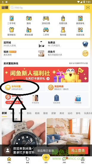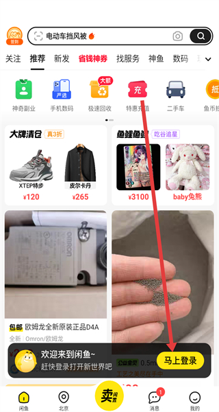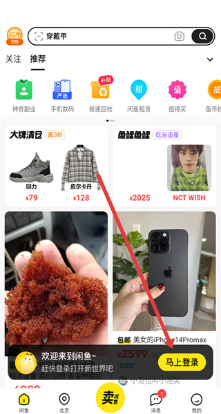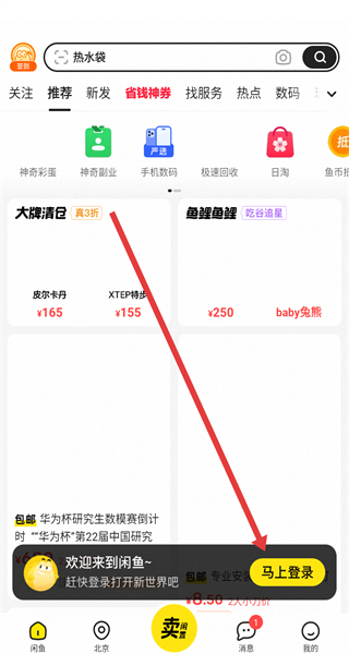 2、在進入到咸魚首頁中,可以點擊下方馬上登錄按鈕,準(zhǔn)備開始進行登錄操作。