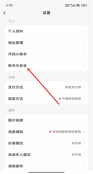 1、進入設(shè)置頁面,點擊“賬號與安全”。