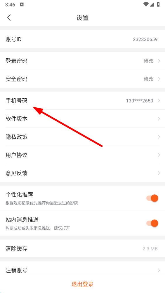 3、在設置頁面,點擊手機號碼選項,進入更換手機號碼。