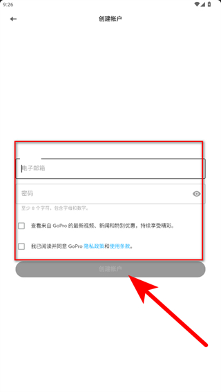 4、填寫電子郵箱和密碼,勾選相關(guān)協(xié)議后,點擊創(chuàng)建賬戶按鈕,完成GoPro Quik賬戶注冊。