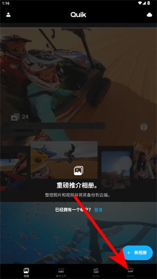 1、打開GoPro Quik應(yīng)用,點擊左上角的個人圖標(biāo)進入個人資料界面。