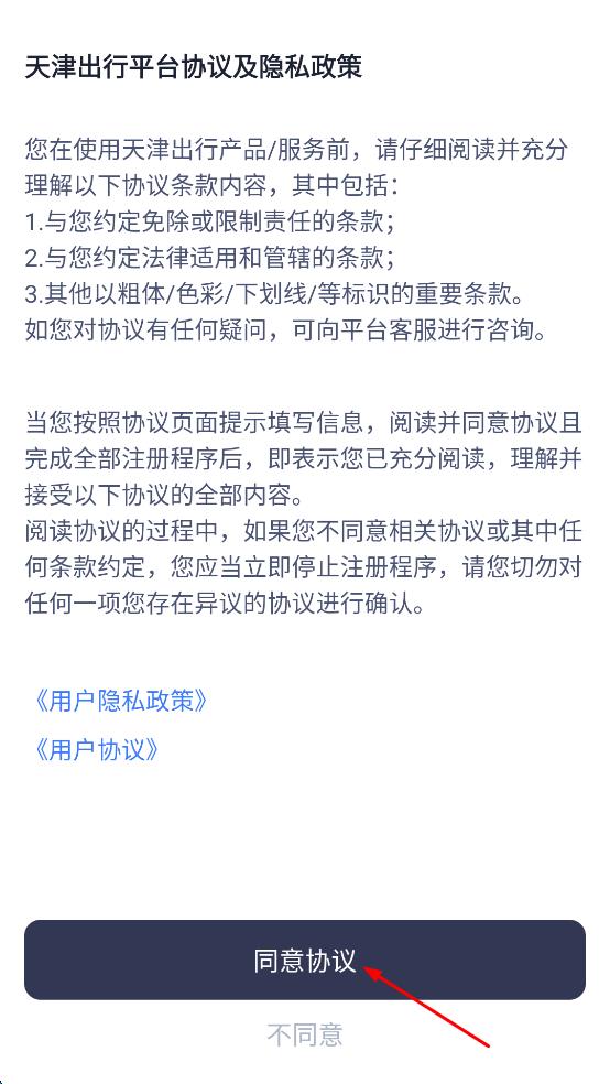 1、打開(kāi)天津出行平臺(tái),在協(xié)議及隱私政策界面,仔細(xì)閱讀相關(guān)內(nèi)容后,點(diǎn)擊同意協(xié)議,進(jìn)入平臺(tái)主界面。