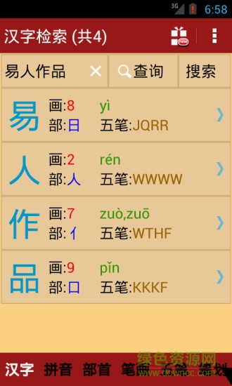 3、輸入拼音->長按查詢->列表選擇(筆畫排序)