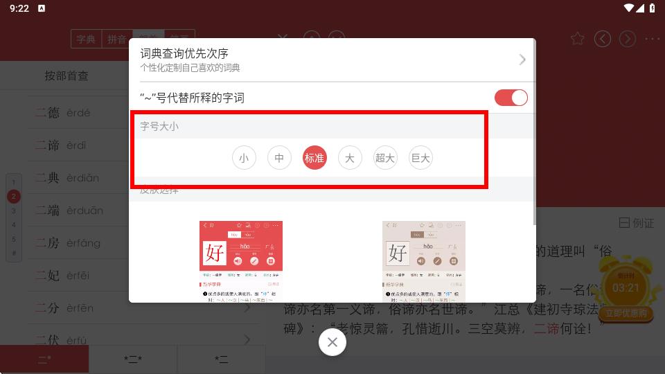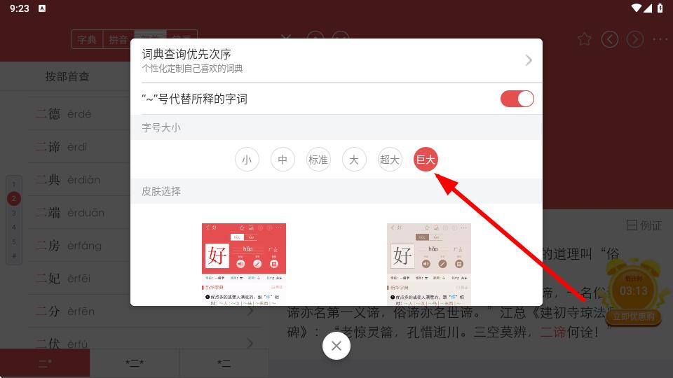 3、根據(jù)自身需求點(diǎn)擊對(duì)應(yīng)字號(hào)選項(xiàng),比如點(diǎn)擊巨大,即可將字典顯示字體調(diào)整為對(duì)應(yīng)大小。