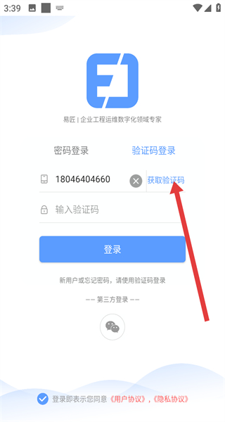 4、將收到的短信驗證碼輸入到驗證碼輸入框中,勾選已同意相關(guān)協(xié)議后,點擊登錄按鈕,完成賬號登錄操作。