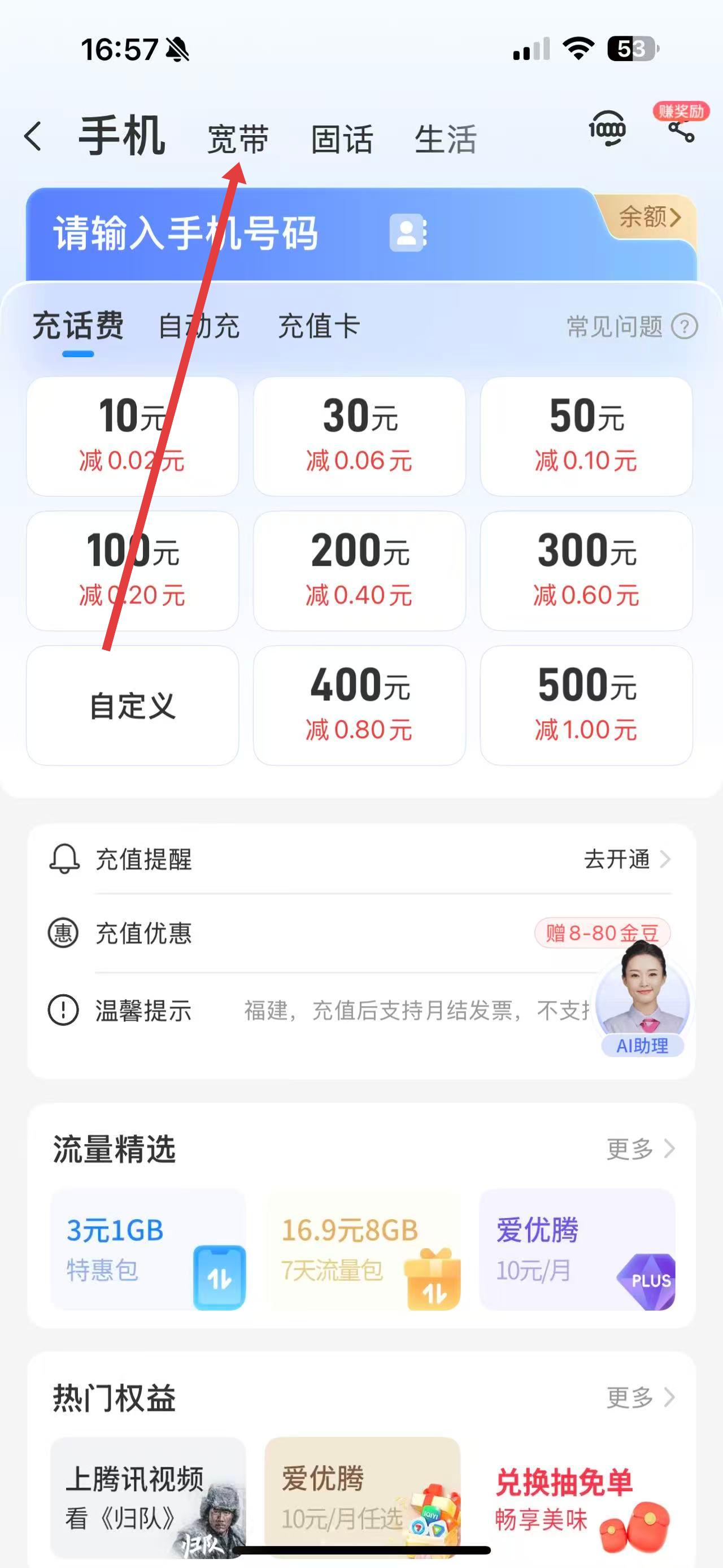 1、打開中國(guó)電信手機(jī)營(yíng)業(yè)廳APP,進(jìn)入充話費(fèi)界面,點(diǎn)擊上方導(dǎo)航欄中的寬帶選項(xiàng)。