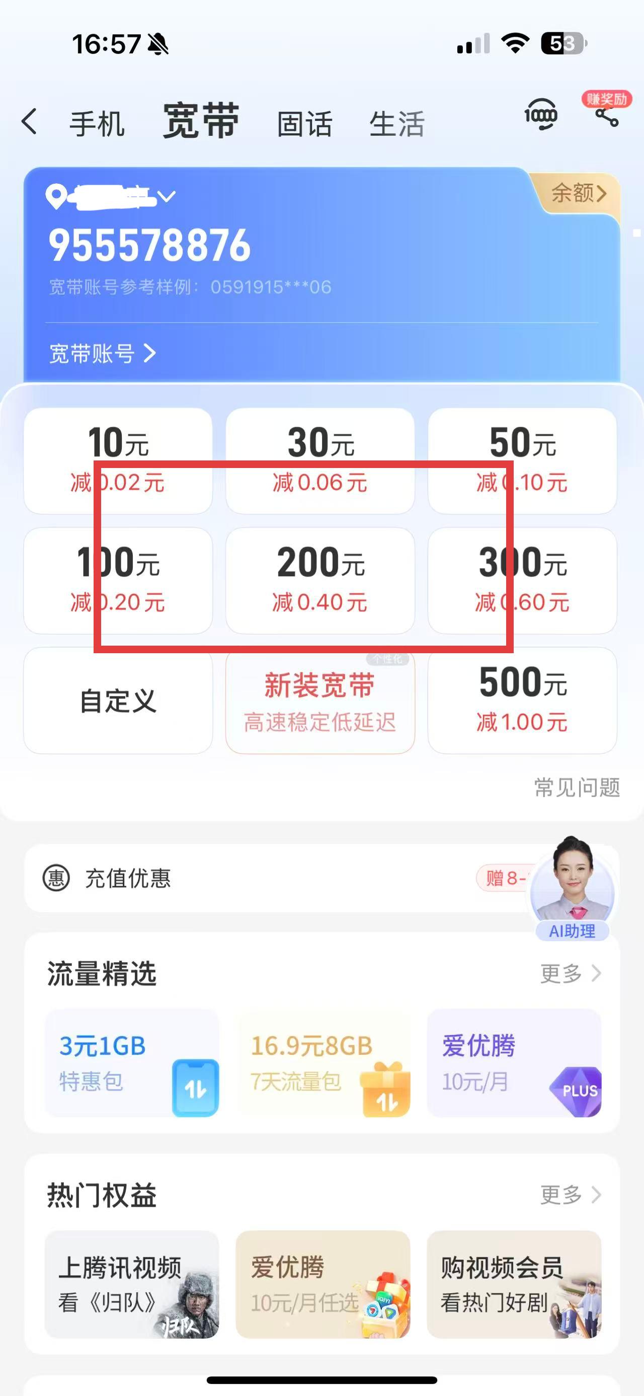 3、輸入賬號(hào)后,選擇您想要充值的金額,比如100元、200元等,然后按照頁面提示完成支付流程,即可成功為寬帶繳費(fèi)。