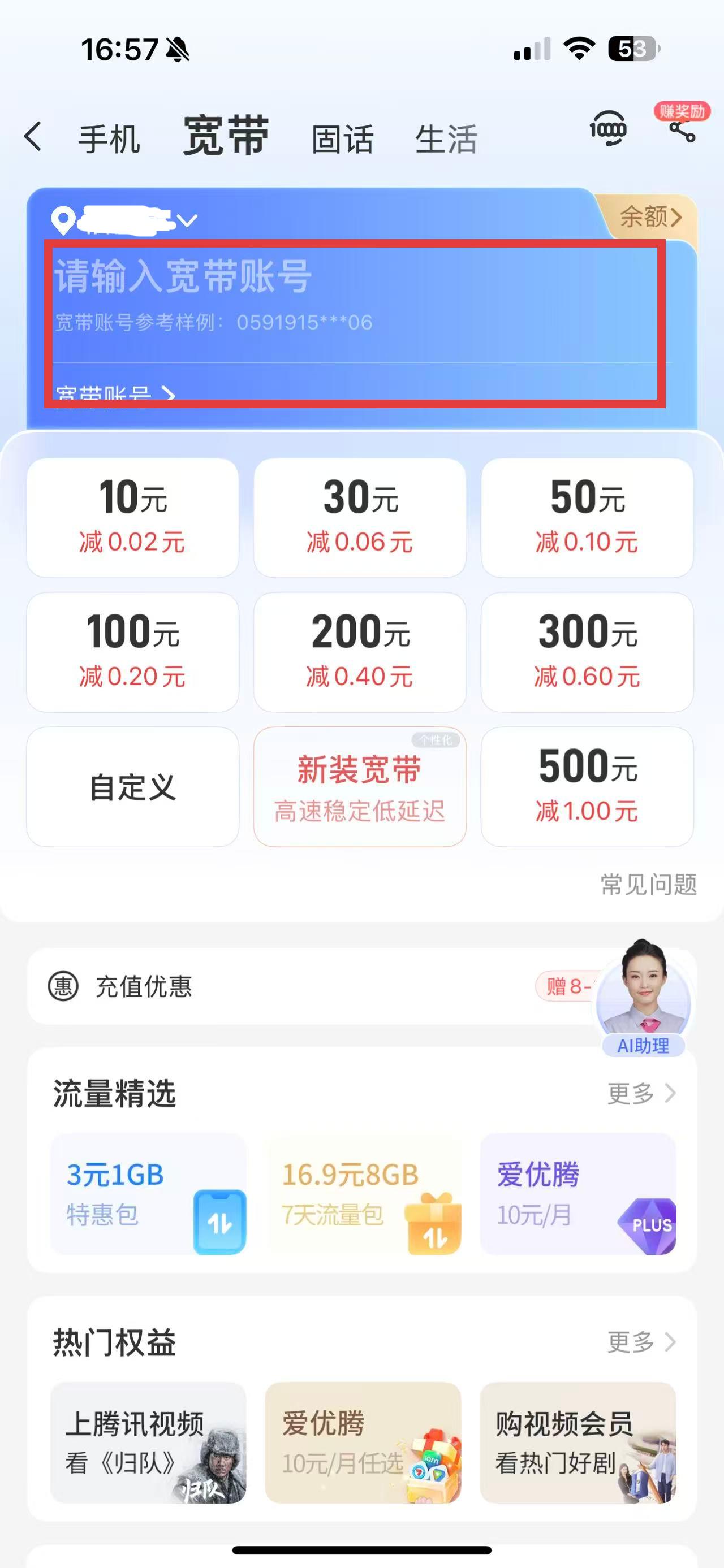 2、在寬帶繳費(fèi)界面,找到請(qǐng)輸入寬帶賬號(hào)的輸入框,準(zhǔn)確填寫您的寬帶賬號(hào)。