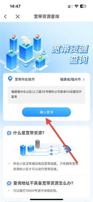 4、確認(rèn)已填寫的地址信息無誤后,點(diǎn)擊確認(rèn)查詢按鈕,即可獲取該地址對(duì)應(yīng)的寬帶資源覆蓋情況。