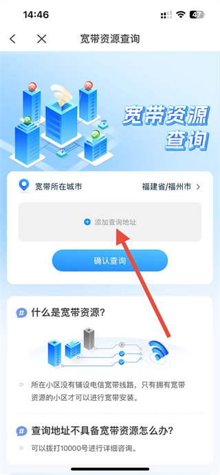 2、在寬帶資源查詢頁面,點(diǎn)擊添加查詢地址按鈕,喚起地址輸入的彈窗界面。