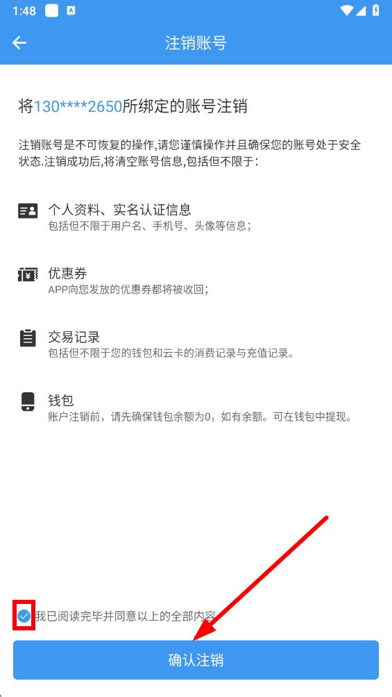 4、在注銷賬號說明界面,勾選同意相關(guān)內(nèi)容的選項(xiàng)框后,點(diǎn)擊確認(rèn)注銷按鈕完成賬號注銷。