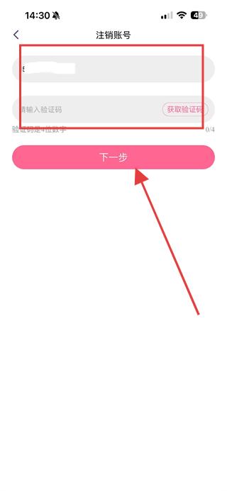 4、在注銷賬號(hào)頁(yè)面,輸入驗(yàn)證碼后點(diǎn)擊下一步,按照提示完成賬號(hào)注銷操作即可。