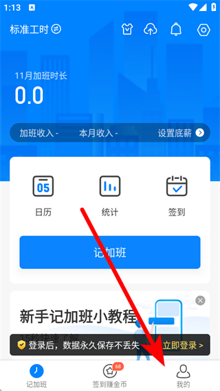 1、打開安心記加班APP,點(diǎn)擊右下角我的,進(jìn)入個(gè)人頁面。