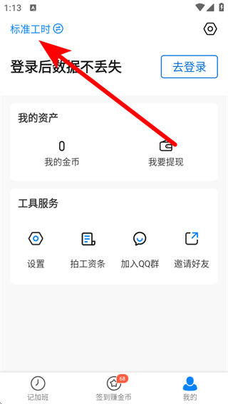 2、在個(gè)人頁面中,點(diǎn)擊左上角標(biāo)準(zhǔn)工時(shí),進(jìn)入工時(shí)制度頁面。