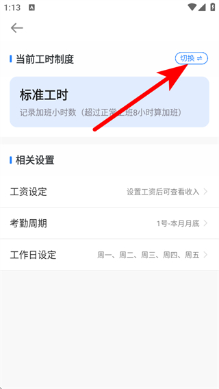 3、在工時(shí)制度頁面,點(diǎn)擊切換,進(jìn)入切換工時(shí)制度頁面。