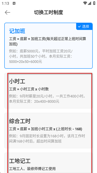 4、在切換工時(shí)制度頁面,選擇需要的工時(shí)制度,完成工時(shí)制度切換操作。