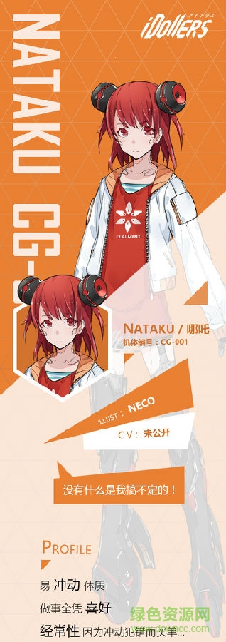 由neco老師負責人設的角色,CG系列機體第一彈--哪吒,腿部采用了特殊的機械設計,性格方面比較容易沖動,容易一時腦熱就做了錯事,希望大家好好珍惜她哦