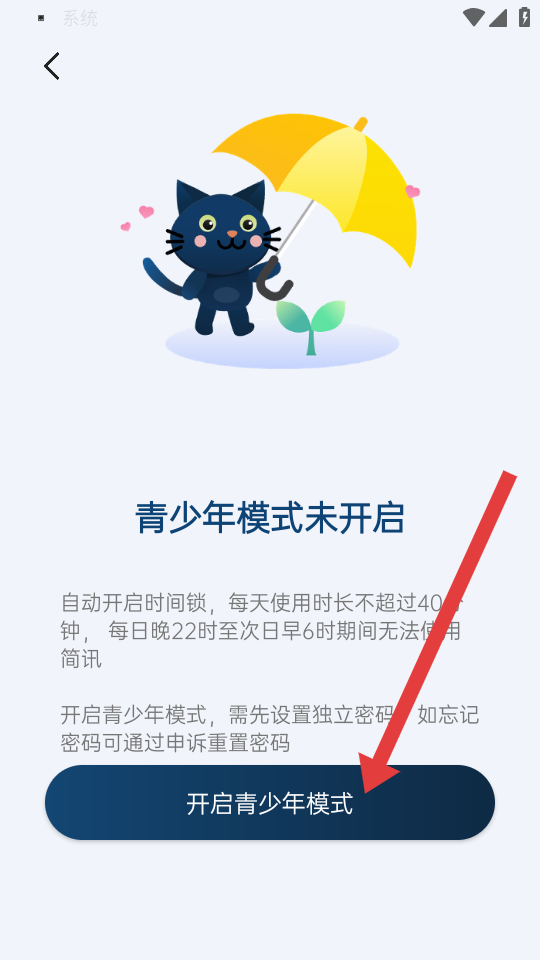 4、在青少年模式界面,點(diǎn)擊開啟青少年模式,即可開啟該模式。