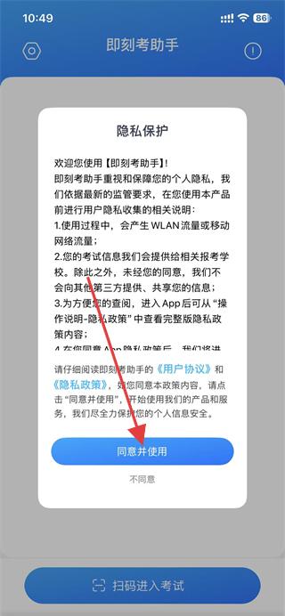 1、打開即刻考助手,在彈出的窗口中,點(diǎn)擊同意并使用。