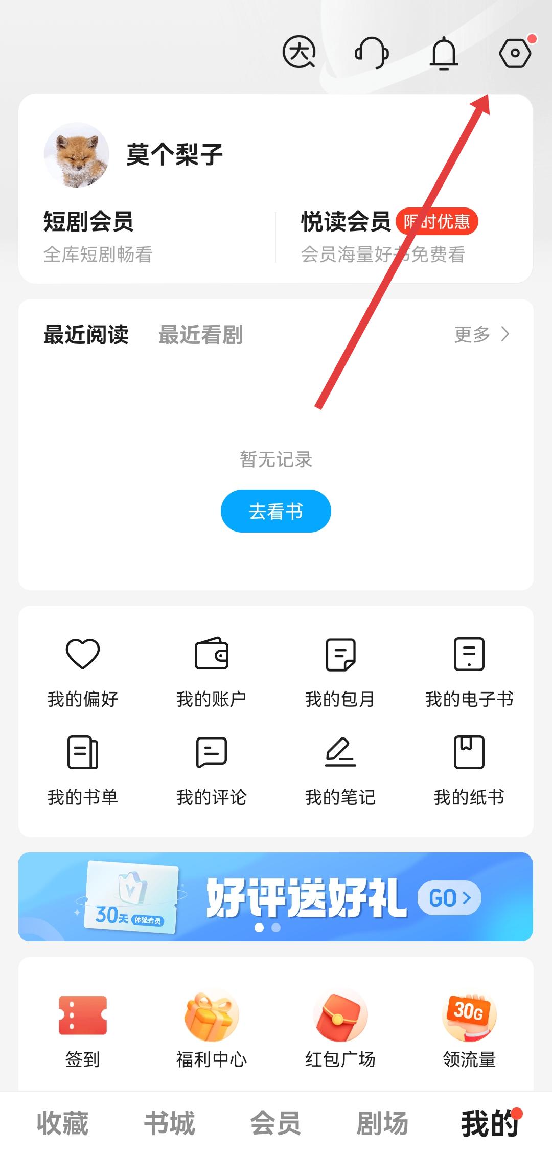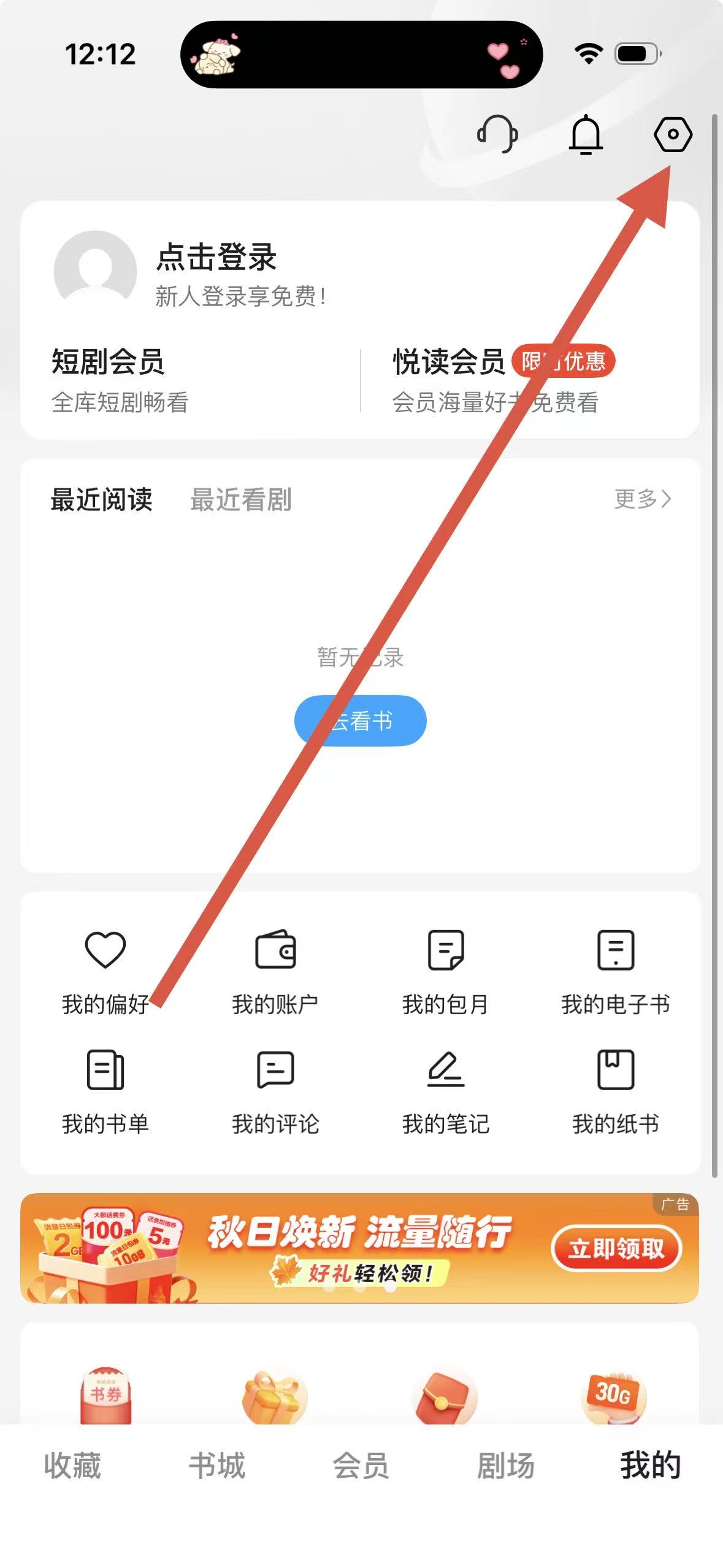 1、打開(kāi)咪咕閱讀APP的軟件,然后進(jìn)入我的頁(yè)面,需要點(diǎn)擊右上角設(shè)置的圖標(biāo),進(jìn)入設(shè)置界面。