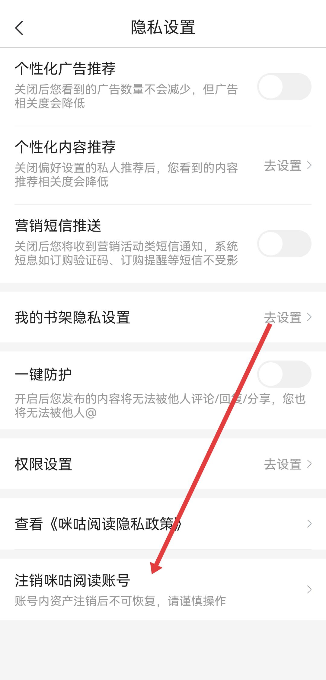 3、在隱私設(shè)置界面,選擇注銷咪咕閱讀賬號(hào),后續(xù)按照提示完成身份驗(yàn)證,確認(rèn)后提交注銷申請(qǐng)。
