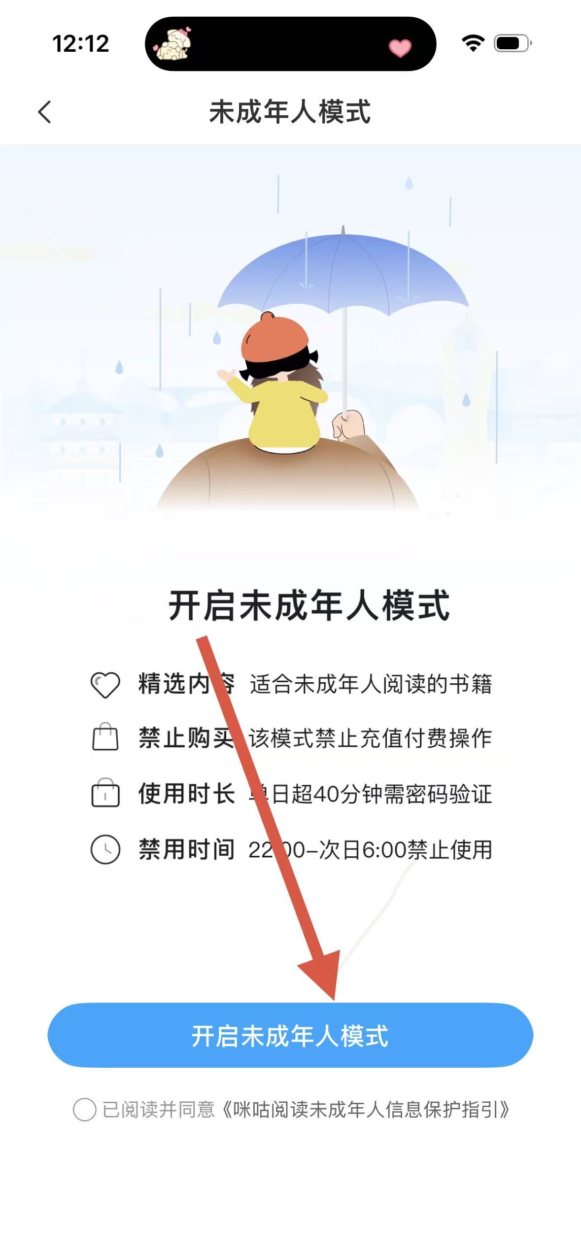4、點(diǎn)擊開(kāi)啟未成年人模式按鈕,并閱讀同意相關(guān)保護(hù)指引后,即可成功開(kāi)啟。