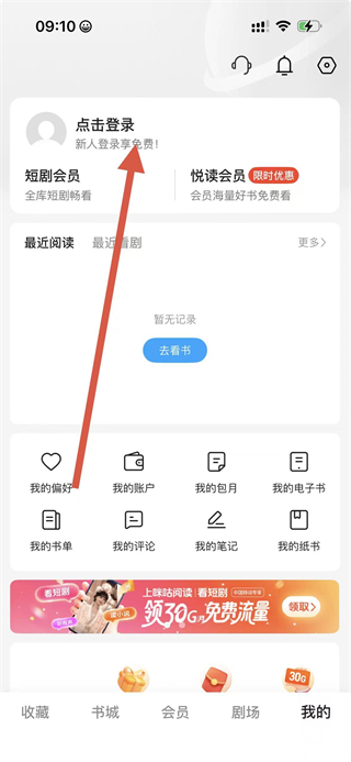 1、在咪咕閱讀書(shū)城頁(yè)面,點(diǎn)擊右下角我的選項(xiàng),進(jìn)入個(gè)人中心頁(yè)面。