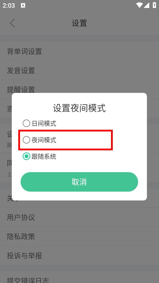 4、在彈出的設(shè)置夜間模式窗口中,選擇夜間模式選項即可成功開啟夜間模式。