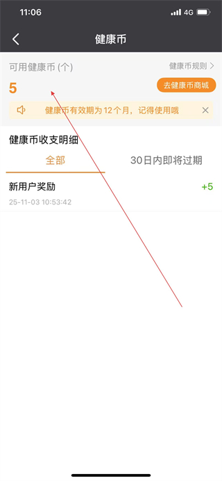3、進(jìn)入健康幣頁面后,即可查看可用健康幣余額。
