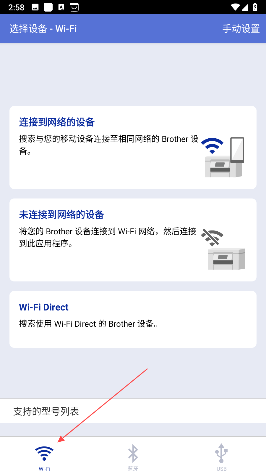 1、進(jìn)入選擇設(shè)備界面點(diǎn)擊Wi-Fi圖標(biāo),若設(shè)備已連網(wǎng)可搜索與移動(dòng)設(shè)備同網(wǎng)絡(luò)的Brother設(shè)備,若設(shè)備未連網(wǎng)先將其連Wi-Fi網(wǎng)絡(luò)再連接應(yīng)用程序,還能搜索使用Wi-Fi Direct的設(shè)備。