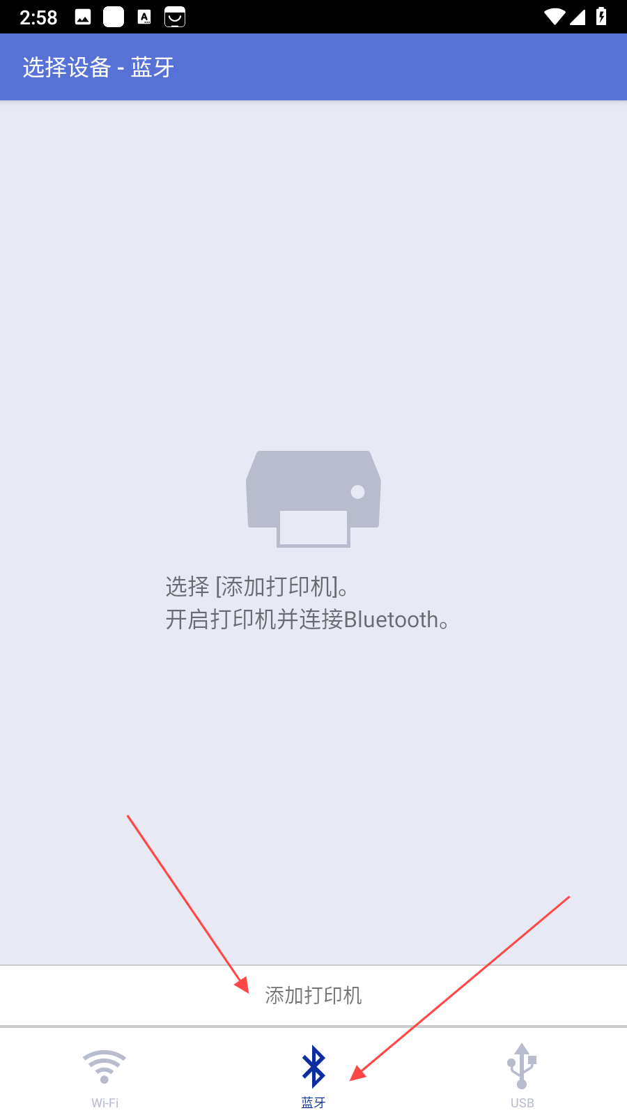 2、在選擇設(shè)備界面點(diǎn)擊藍(lán)牙圖標(biāo)進(jìn)入藍(lán)牙連接頁(yè)面,選擇添加打印機(jī)選項(xiàng),開啟打印機(jī)并將其藍(lán)牙功能打開,等待應(yīng)用搜索并配對(duì)連接打印機(jī)。