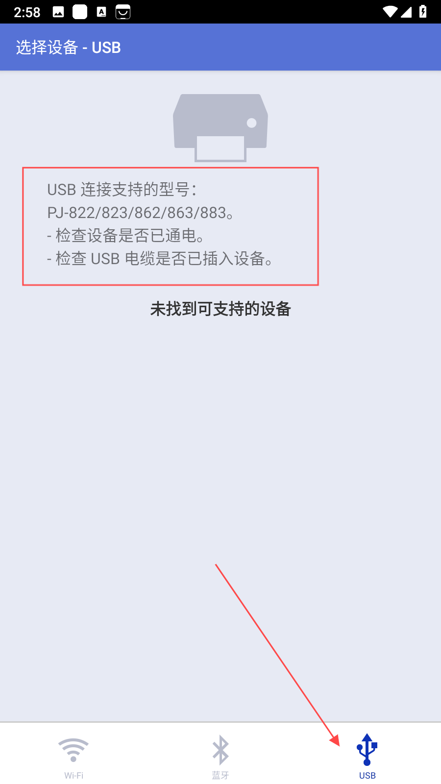 3、點(diǎn)擊選擇設(shè)備界面的USB圖標(biāo)查看支持USB連接的型號(hào)如PJ-822/823等,檢查打印機(jī)是否通電以及USB電纜是否正確插入設(shè)備,若設(shè)備型號(hào)支持且連接正常即可通過(guò)USB連接打印。