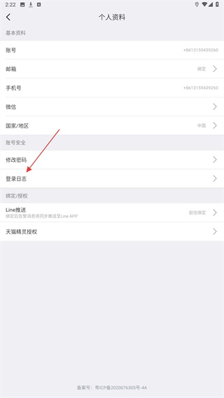 3、進(jìn)入個(gè)人資料的頁(yè)面內(nèi),點(diǎn)擊登錄日志的按鈕。
