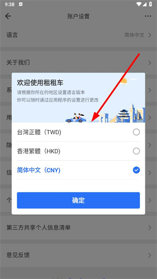 4、在語言選擇列表中,選擇想要設置的語言,點擊確定即可完成租租車語言的修改操作。