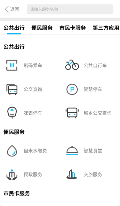 提供刷碼乘車、公共自行車、公交查詢、智慧停車、咪表停車、城鄉(xiāng)公交查詢服務(wù)
