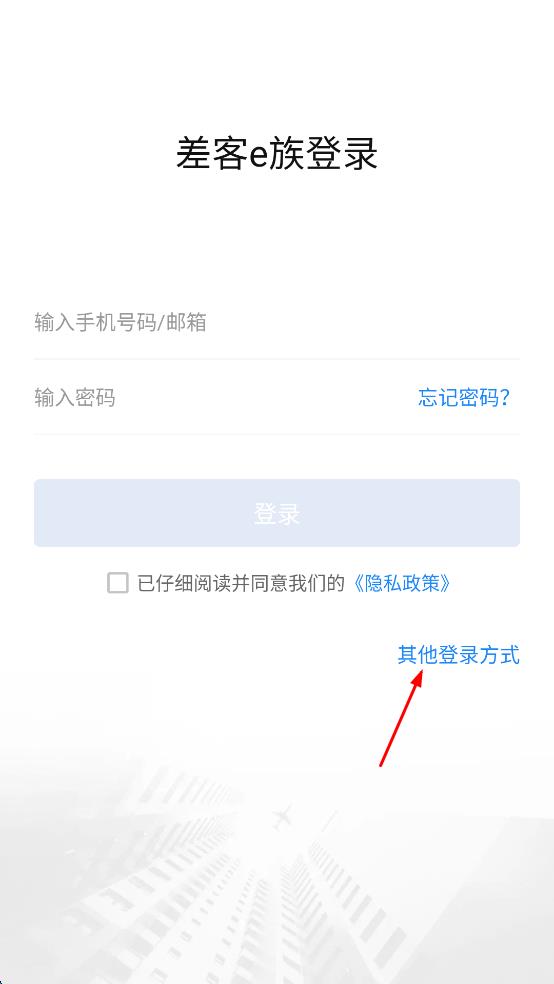 1、打開差客e族軟件,在登錄界面點(diǎn)擊“其他登錄方式”,進(jìn)入其他登錄選擇頁面。