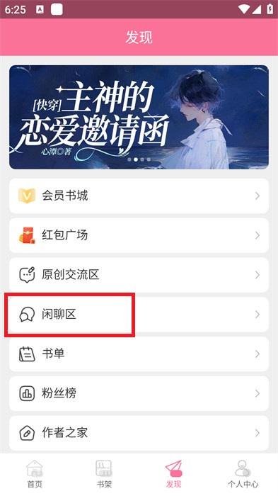 2、在發(fā)現(xiàn)界面中我們可以看到【閑聊區(qū)】點(diǎn)擊進(jìn)入到此功能界面;