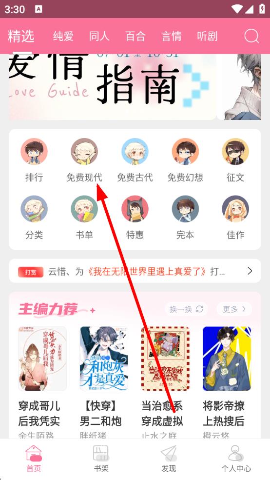 1、進(jìn)入書耽APP首頁,點(diǎn)擊免費(fèi)現(xiàn)代分類入口,進(jìn)入免費(fèi)現(xiàn)代小說列表頁。