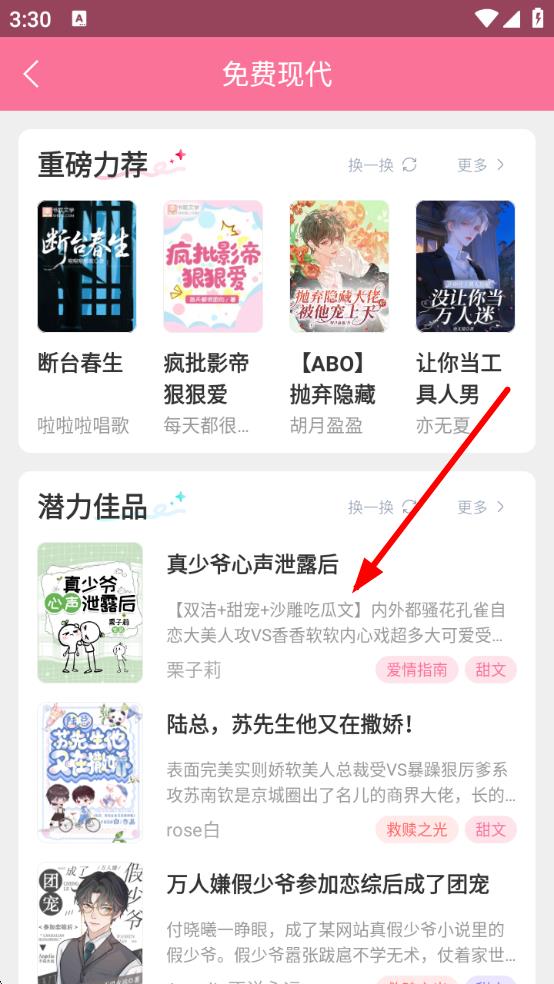 2、在免費(fèi)現(xiàn)代列表中,找到并點(diǎn)擊想讀的小說如真少爺心聲泄露后,進(jìn)入小說詳情頁。