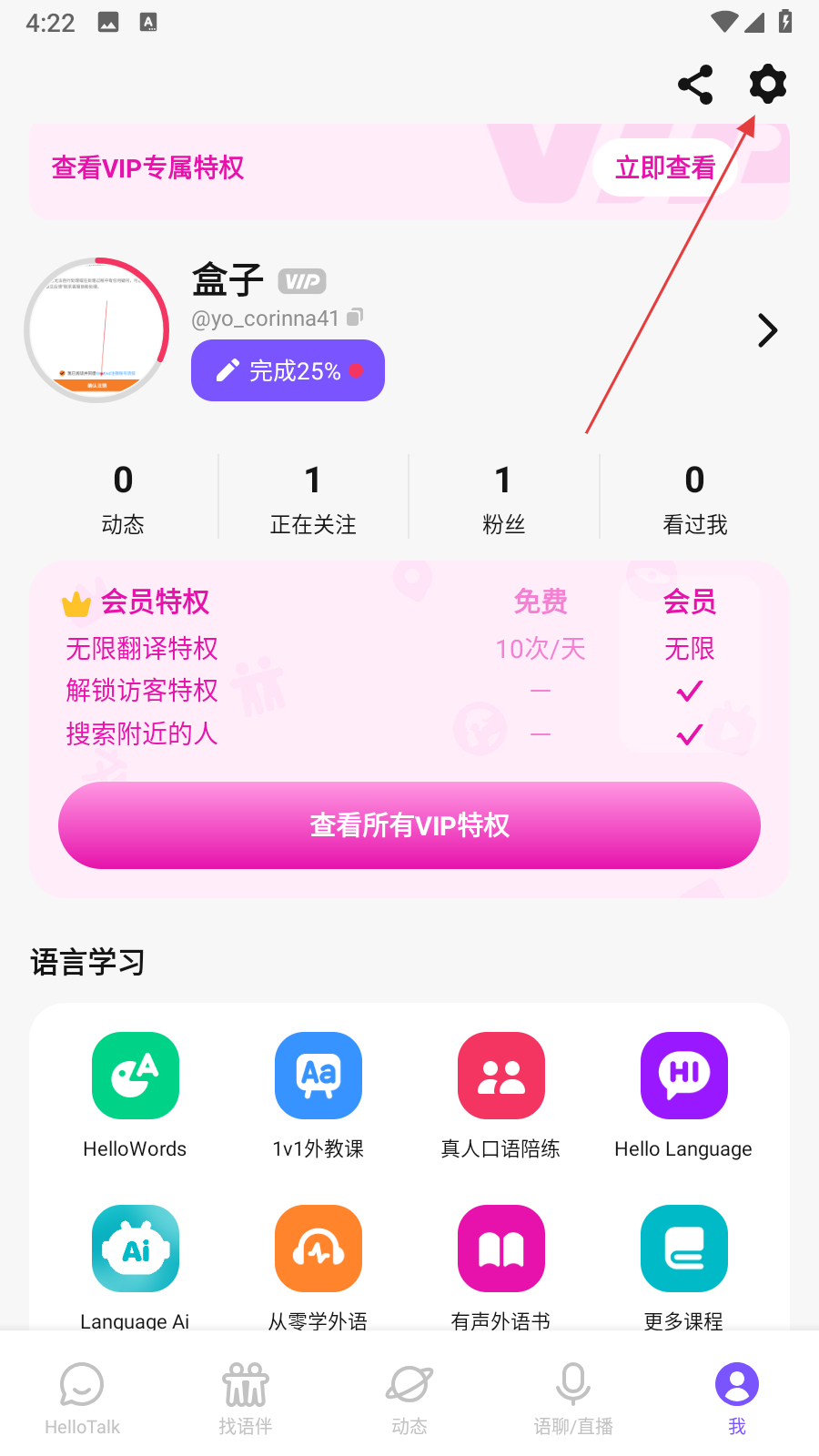 1、打開HelloTalk應(yīng)用,進(jìn)入我的頁面,點(diǎn)擊右上角齒輪形狀的設(shè)置圖標(biāo)。
