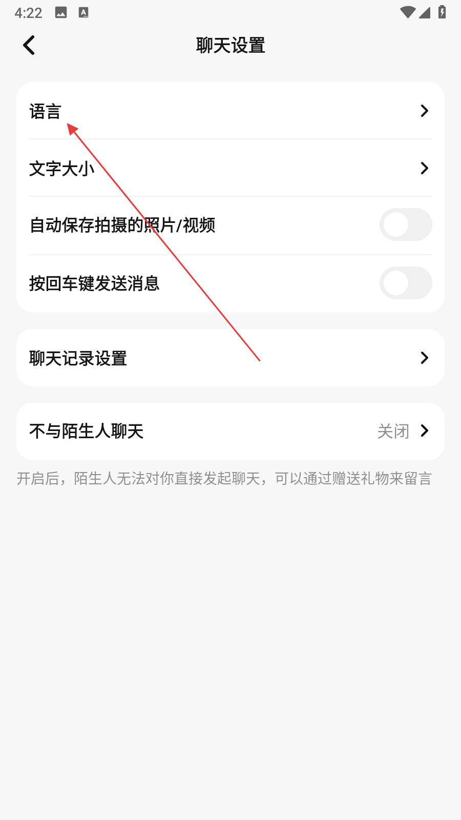 3、在聊天設(shè)置頁面里,點(diǎn)擊語言選項(xiàng),進(jìn)入語言選擇界面。