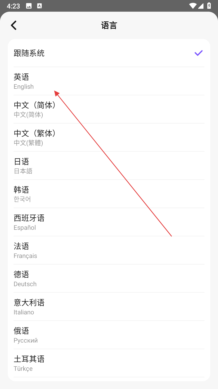 4、在語言選擇界面中,從列出的語言列表里,點(diǎn)擊想要切換的目標(biāo)語言。
