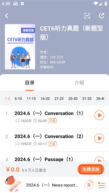 2、右下角綜合這里有一個(gè)【免費(fèi)添加】的按鍵,將這個(gè)資源給添加到自己所激活的英語資源中,進(jìn)行下一步的音頻激活;